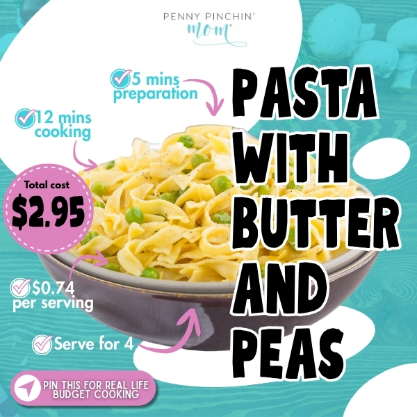 One pound pasta ($1.00), frozen peas ($0.99), butter ($0.50 for the amount used), parmesan ($0.46). Boil pasta, add frozen peas in the last 3 minutes, drain, toss with butter and cheese. Frozen vegetables cost less than fresh, pasta is filling, and butter creates richness without meat. Stir in a beaten egg at the end for extra protein and a creamy carbonara-style texture.