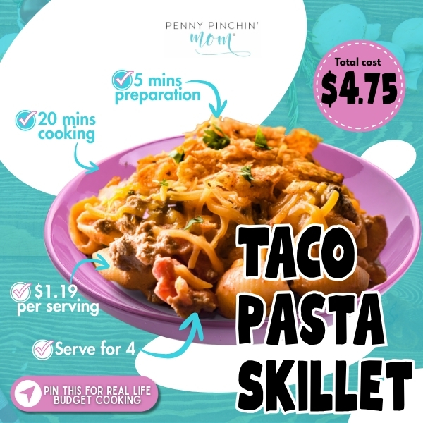 Half pound ground beef ($1.50), one box pasta ($1.00), one can diced tomatoes with chilies ($0.89), taco seasoning ($0.36), shredded cheese ($1.00). Brown beef, add uncooked pasta, tomatoes, water, and seasoning. Simmer until pasta is tender, top with cheese. Everything cooks in one pot, eliminating the need for separate taco shells or multiple components. Use ground turkey when it’s on sale for the same price.