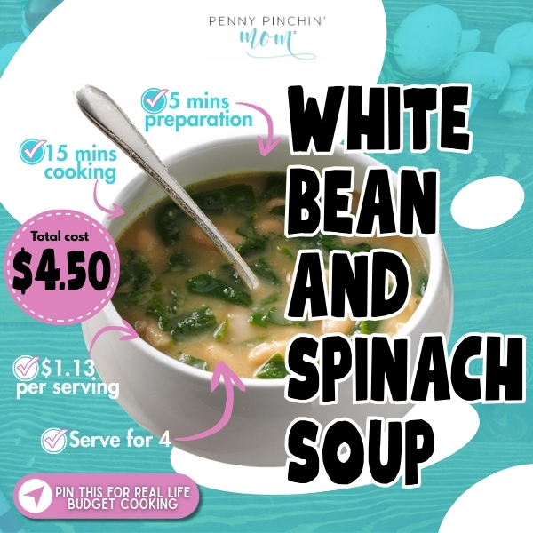 Two cans white beans ($1.78), one box chicken broth ($0.99), frozen spinach ($0.99), garlic ($0.24), parmesan rind ($0.50 or free if saved). Simmer everything together until heated through, mash some beans to thicken. Budget-friendly because canned beans are shelf-stable protein and frozen greens cost less than fresh. Save parmesan rinds in the freezer for soups like this – they add depth and richness for free.
