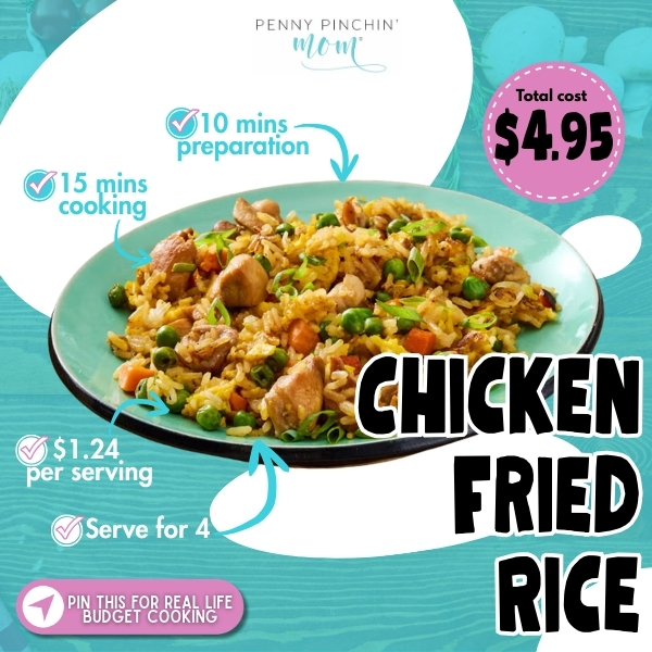 Two chicken thighs ($1.98), 3 cups cooked rice ($0.90), frozen mixed vegetables ($0.99), eggs ($0.58 for 2), soy sauce ($0.50). Dice and cook chicken, scramble eggs, add cold rice and vegetables, season with soy sauce. Budget-friendly because it uses cheap dark meat chicken and transforms leftover rice into dinner. No leftover rice? Cook it in the morning and refrigerate so it’s ready by dinner.