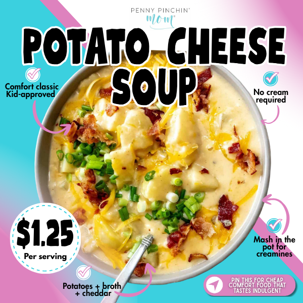 Five pounds of potatoes run about $4 and make enough soup to feed your family twice. Dice them small, so they cook faster – about 20 minutes in chicken broth. The secret is mashing some of the potatoes right in the pot to make it creamy without adding cream. A bag of shredded cheddar (about $3.50) goes in at the end. Total cost comes in under $10 for eight servings. Back when we were paying off debt, I made this every other week because the ingredients are basics you probably have anyway. Top with bacon bits if you splurged on a package.