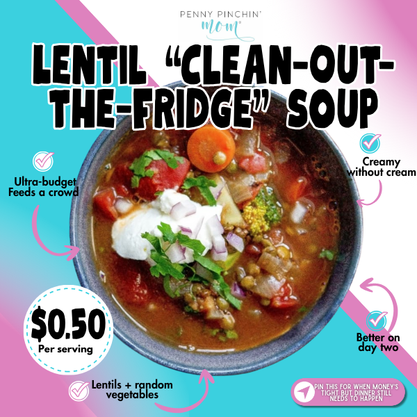 Dried lentils cost pennies per serving and don’t need soaking like other beans. A one-pound bag typically costs $2 and makes enough soup for eight servings – that’s 25 cents per bowl before you even count the vegetables. Use whatever needs using up: half an onion, those three carrots rolling around, the celery going limp. The whole pot comes together in about 45 minutes and gets better the next day. Add a can of diced tomatoes if you have one. Lentils cook fast and turn creamy without any effort from you.