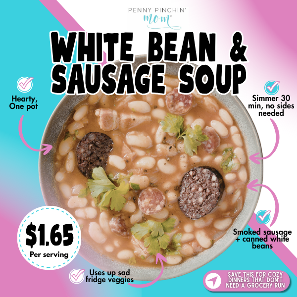 One pound of smoked sausage costs about $4, and a few cans of white beans cost maybe $3 total. This feeds six people for under $10, which comes to about $1.65 per serving. Browning the sausage slices first gets those crispy edges, then everything simmers together for 30 minutes. The beans make it filling enough that you don’t need sides – just some crusty bread if you have it. Prep takes 10 minutes, cooking another 30. Throw in whatever vegetables are getting soft in your crisper drawer. I’ve used spinach, kale, diced carrots, even frozen mixed vegetables.