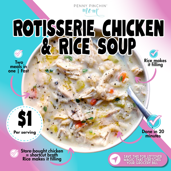 When your grocery store marks down rotisserie chickens at the end of the day, grab one for around $5 instead of the usual $7-8. One chicken gives you meat for soup plus bones for broth – two meals in one. Add rice (maybe 50 cents worth), some carrots and celery (another $2), and you’ve got eight servings for under $8 total. That’s a dollar per bowl. The whole thing takes 20 minutes if you use the store chicken. Pick the meat off while the broth simmers, then add everything back in the last 10 minutes.