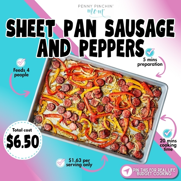 This is the meal I make when I’m already tired before dinner even starts. Slice 1 lb kielbasa ($3.99) and 3 bell peppers ($2), toss with onion and olive oil on a sheet pan, roast at 425°F for 20 minutes. The sausage gets crispy edges and the peppers char just right. Total cost: $6.50, feeds 4 for $1.63 per serving. My kids fight over the crispy sausage bits. Prep time: 5 minutes. Cook time: 20 minutes. Serves: 4. Why it’s budget-friendly: One pan, no fancy ingredients, and kielbasa is pre-cooked so you’re just heating and crisping. Tip: Serve over rice or pasta if you need to stretch it further – adds 50 cents and feeds 6 instead.
