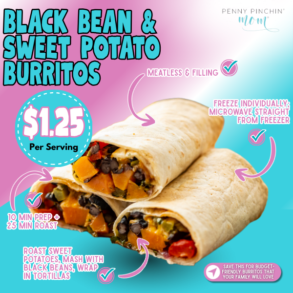 When meat prices feel out of reach, these come to the rescue. Canned black beans cost about $1 per can, and sweet potatoes run maybe $1 per pound. Roast diced sweet potatoes with cumin and garlic powder for 25 minutes, then mash them slightly with the beans. Wrap in tortillas with cheese and salsa, then wrap each burrito in foil and freeze. The whole batch of eight burritos comes in around $10. Microwave straight from frozen for three minutes, flipping halfway through. Add hot sauce or sour cream when you reheat them to make them feel less like leftovers.