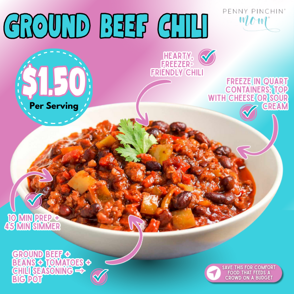 When ground beef goes on sale for under $4 per pound, I make a huge pot of chili. Two pounds of beef, three cans of beans at $1 each, two cans of tomatoes, and one packet of chili seasoning total about $15 for ten generous servings. The whole thing simmers on the stove for 45 minutes, then I freeze it in quart containers. Each serving costs about $1.50. Reheat straight from frozen in the microwave or on the stovetop. Top with shredded cheese and sour cream if you want to get fancy, but it’s hearty enough on its own.