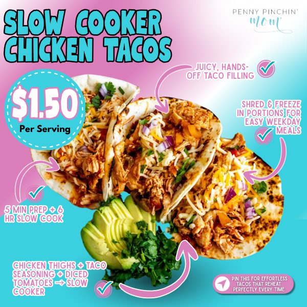 Chicken thighs run about $1.99 per pound, and three pounds feeds eight people for under $10 total. Toss them in the slow cooker with a $1 packet of taco seasoning and a can of diced tomatoes. Cook on low for six hours while you’re at work. Shred the chicken right in the pot, portion it into freezer bags, and you’ve got taco filling ready to reheat. Prep takes five minutes, and the whole batch costs around $12 for eight servings. Serve with rice and beans to stretch it even further, or load up tortillas with whatever toppings you have on hand.
