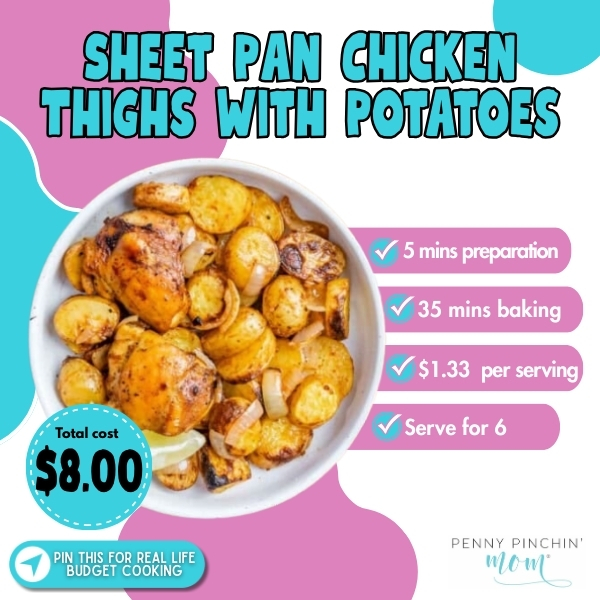 When I’ve got nothing left in me, this is what happens. Toss 8 bone-in thighs ($4.50) with quartered potatoes, whatever frozen veggies are in the freezer, olive oil, and garlic powder on a sheet pan. Roast at 425°F for 35 minutes while you decompress. Total cost around $8, feeds 6 people ($1.33 per serving), and the crispy chicken skin paired with those golden potatoes tastes like actual dinner, not survival mode. Prep time: 5 minutes. Cook time: 35 minutes. Swap thighs for drumsticks when they’re on sale for even less.