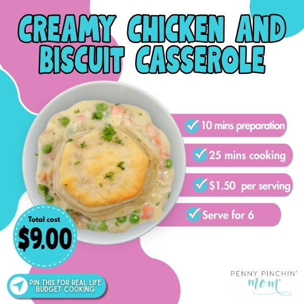 Pure comfort when you need a win. Shred a rotisserie chicken ($5 on sale), mix with a can of cream of chicken soup ($1), frozen mixed veggies ($1.50), and top with refrigerated biscuits ($1.50). Bake at 375°F for 25 minutes until the biscuits are golden and the filling bubbles up the sides. Total cost: $9 for 6 servings ($1.50 each). That flaky biscuit soaking up the creamy filling is exactly what tired weeknights need. Prep time: 10 minutes. Cook time: 25 minutes. Stretch it further by adding a can of drained chickpeas.