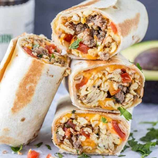 Roll scrambled eggs, cheese, and cooked breakfast sausage in small flour tortillas. Place seam-side down on a baking sheet, spray with cooking spray, and bake at 400°F for 15 minutes until crispy. About $10 makes 15 taquitos. Freeze them and reheat in the oven at 375°F for 12 minutes. Crispier than burritos and easier for little hands to hold. Serve with salsa or eat them plain.