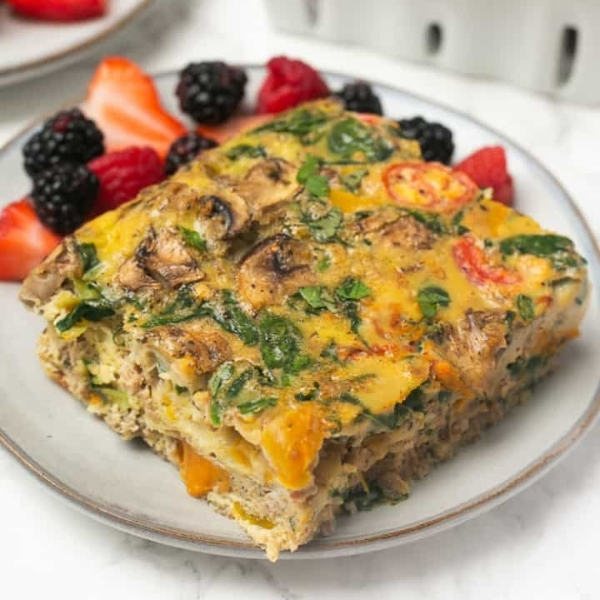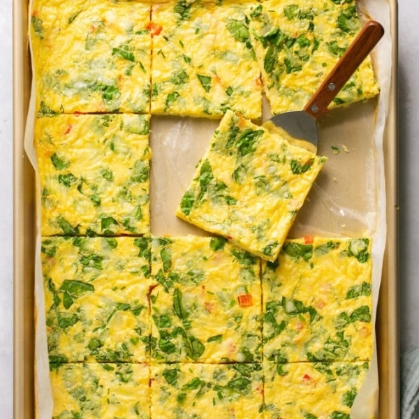 When you need something that looks fancy but costs under $10 for eight servings, this works. Beat eggs with milk, stir in cooked turkey sausage and whatever vegetables need using up. Bake in a greased 9×13 pan at 350°F for 30 minutes. Cut into squares and refrigerate. Reheat a slice for 60 seconds. Lasts five days. Zucchini, tomatoes, mushrooms, and spinach all work and use up produce before it goes bad.