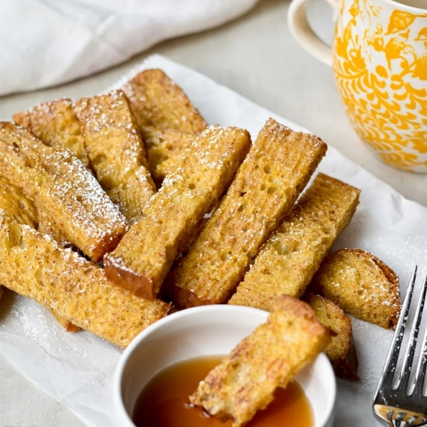 Cut Texas toast into strips, dip in an egg-milk-cinnamon mixture, and bake on a sheet pan at 375°F for 15 minutes. About $8 feeds the whole family for three mornings. Freeze them in a single layer on parchment, then bag them up. Pop four sticks in the toaster for crispy edges. Way cheaper than the frozen ones at the store, and they taste like real French toast. Dip them in syrup or peanut butter.