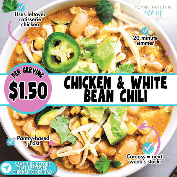 The rotisserie chicken nobody finished yesterday becomes dinner for 6 tonight. Strip the meat off (about 2 cups), add it to a pot with canned white beans, chicken broth, salsa verde, and cumin. Simmer 20 minutes. Total: $8 if you’re working with sale chicken ($5) and pantry staples. Serve with tortilla chips or cornbread. Takes 10 minutes to throw together. The carcass simmering in water right now will be stock for next week’s soup.