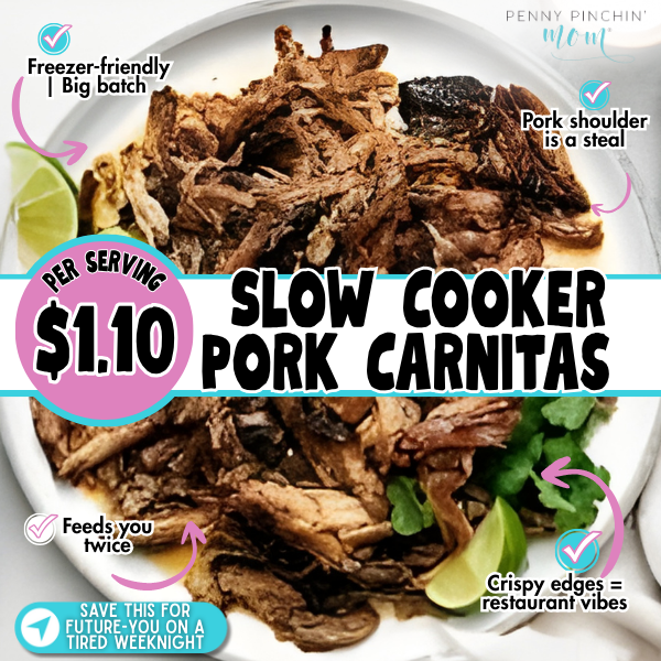 Pork shoulder drops to $1.99/lb regularly, and one 3-pound shoulder feeds a family twice. This version adds up to roughly $10 and makes enough for 8-10 servings. Season the meat, add orange juice and lime, and cook on low for 8 hours. Shred it, crisp under the broiler for 5 minutes. Serve in tortillas with onions and cilantro. The smell when you walk in after work makes everyone forget you spent almost nothing. Freeze half for another easy dinner next month.