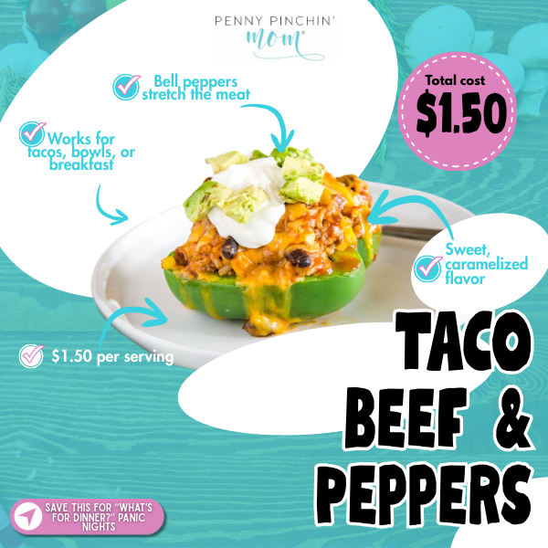 When bell peppers go on sale for under $1 each, I make this. A pound of ground beef costs over $6 these days, but it stretches with three peppers and an onion (maybe $1). Season the beef with taco seasoning (homemade or a $1 packet), spread it on a sheet pan with sliced peppers and onions, and bake at 425°F for 20 minutes. Total cost is around $9 for 6 servings, or $1.50 each. Prep time is 10 minutes. Serve in tortillas ($3 for a pack) or over rice. The peppers get sweet and caramelized. Save leftovers for breakfast burritos.