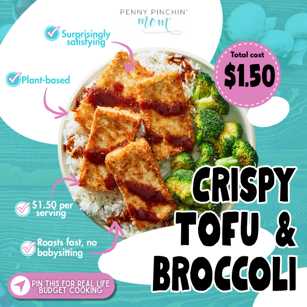 For about $6, you get a complete plant-based dinner for 4 people. A block of tofu costs around $2.50, and broccoli crowns come in at about $2. Press the water out of the tofu, cube it, and season with soy sauce and cornstarch. Roast with broccoli florets at 425°F for 30 minutes, flipping halfway. Prep time is 15 minutes. Serve over rice (pennies per serving) with extra soy sauce or teriyaki. The cornstarch makes the tofu crispy on the outside. Add sesame seeds if you have them lying around for extra flavor.