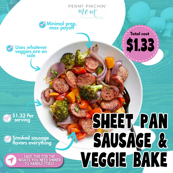 Smoked sausage runs me about $4 for a package, and I toss it with whatever vegetables are on sale. Today, that’s potatoes (under $3 for a 5-lb bag), bell peppers ($1.50 each), and onions (maybe $1). You’re looking at $8 total, and it feeds 6 people, so about $1.33 per serving. Prep takes 10 minutes. Just chop everything into chunks. Roast at 425°F for 35 minutes. Drizzle olive oil and season with garlic powder, paprika, and Italian seasoning. The sausage releases juices that flavor the vegetables, so you don’t need fancy ingredients. Swap the sausage for chicken thighs if they’re cheaper that week.